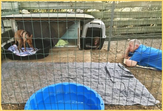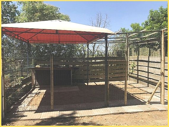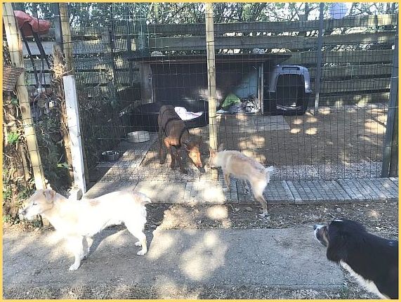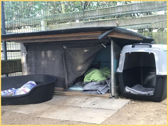Pepito und Naila zogen vorerst hier ein Da beide Hunde nicht viel kennen, grosse Angst vor Menschen haben und es gewohnt waren draussen zu sein, waren sie fürs Erste zusammen untergebracht. So konnten sie langsam Kontakt aufnehmen, uns und unsere Hunde kennenlernen und hatten einen gesicherten Rückzugsort,