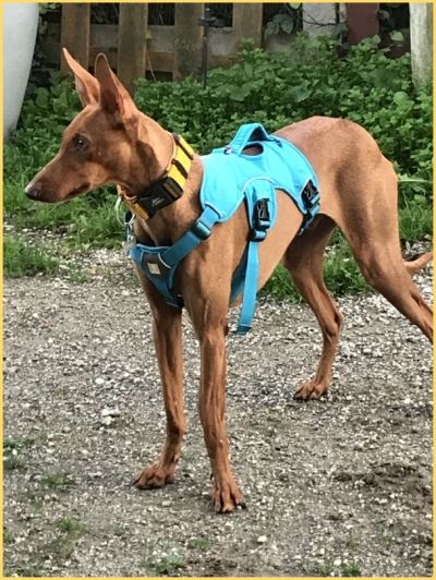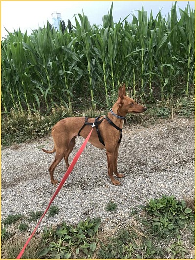 Mit der Zeit kommt Pepito immer freudiger mit zum Spazieren, das Geschirr anziehen ist eine Geduldsprobe, da er immernoch erstarrt wenn ich etwas an ihm machen will, doch wenn er es mal an hat, rennt er zum Tor und möchte unbedingt mit