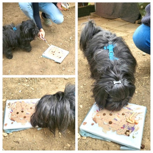 Die Hunde bekommen auf einer Folie etwas zum Ablecken (Leberwurst/Nassfutter/Quark....)