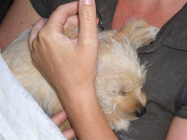 Yoshi erholt sich langsam. Er wird alle 1 - 2 Stunden mit Welpenmilch gefüttert und hat fast ununterbrochen Körperkontakt. So hat er Wärme und Geborgenheit, wenigstens von uns Menschen, wenn er schon keine Mutter mehr hat.